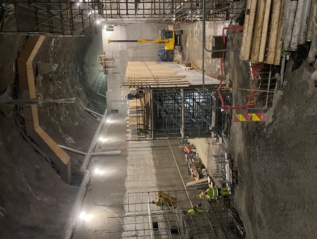 Ca. 2.500 m3 plasstøpt betong, ny inngangsportal stasjonshall i lys betong. Plasstøpte kummer og kjørearealer, betongportal for rømnings tunnel.